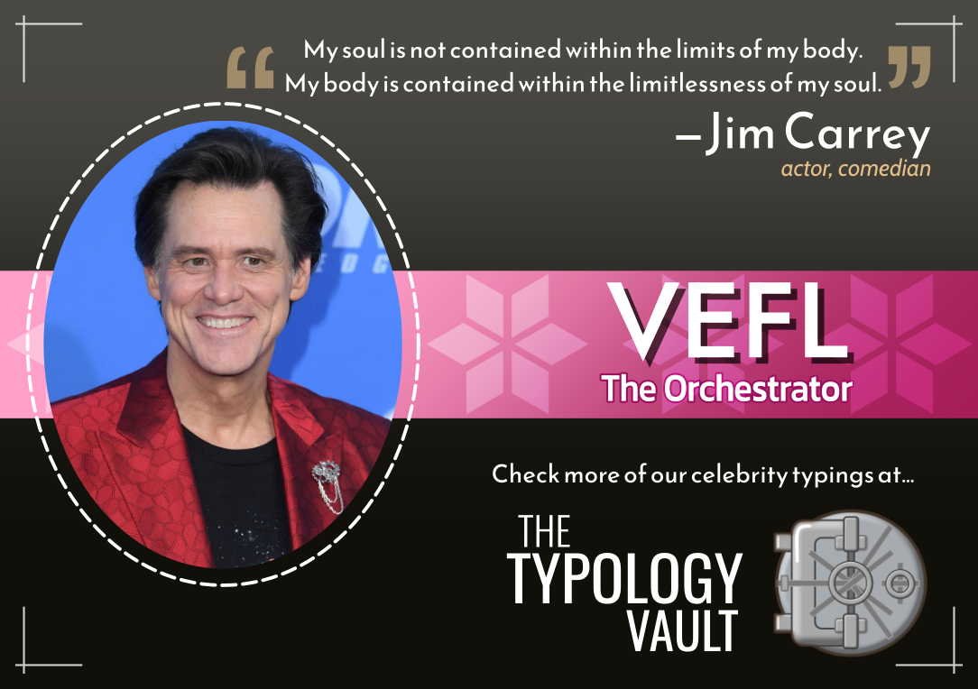 VEFL is the Attitudinal Psyche type that seems the most interested in moving others emotionally, organizing events, and doing anything within their power to create circumstances that enable enthusiastic involvement. The VEFL appears to be protecting themselves from feeling burnt out, trapped in disorder, or rejected due to not being physically enough for the task at hand. They may come off as lively, animated, managerial, pushy, comedic, entertaining, vigorous, spiritual, artistic, movement oriented, controlling, attention seeking, or at times volatile if they sense impending burn-out or rejection. The VEFL seems to want control over their identity through involving themselves in the atmosphere through directing others towards order, positivity, and striving towards goals.
